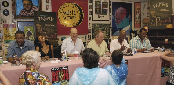 Pierce, Peters, Khandi Alexander (LaDonna Batiste-Williams), Rob Brown (Delmond Lambreaux) and producers David Simon and Eric Overmyer were on hand for the signing at the Louisiana Music Factory, and Tom McDermott played musical accompaniment at a piano onstage while they signed. He has a track on the season two CD, “Heavy Henry,” with Evan Christopher and Treme‘s Lucia Micarelli.