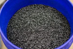 Polyvinyl chloride plastic is used in vinyl records, floors, clothes and more. The pellets are melted into heated pucks that are then pressed inside of a stamping machine. Photo by Dalton Spangler.