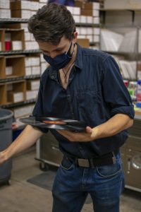 Wyatt True assists in the pressing process at NORP by visually inspecting each record before sending the vinyl disks to the next work station.