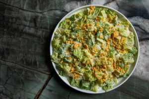 Sinclair’s favorites include Pork Belly with grilled napa cabbage, fennel, and chili crisp. Sinclair explained that the skin-on pork belly is sous vide for twelve hours overnight, cut into blocks, fried, sliced, and finished in the oven with marinated cabbage cooked on a wood-fired grill. Caesar salad, a holdover from the menu at Longway Tavern, is prepared with an anchovy dressing and heavy seasonings. He prefers not to add croutons to the salad to keep it gluten-free, instead using grated parmesan baked until it’s crispy. Broccolini is steamed, then prepared on the broiler, and garnished with sunflower, olive oil, lemon, and Tabasco dust.