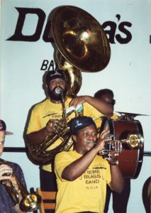 Charlie Sims was from Chicago, so he was not as familiar with the brass band culture of New Orleans as Donna. But as luck would have it, she said, “He came back home and he busted through the door and says, ‘Oh my gosh, I know what you mean about a New Orleans brass band. I heard Tremé Brass Band on the train.’ I said, ‘You did? Did you ask them about a gig?’ and that’s how it all got started.”