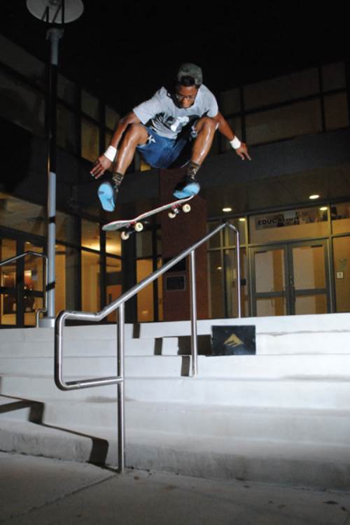 Ollie North over handrail and six-stair, Skater: Justin, Listening to "Hell of a Night" by Schoolboy Q (Photo: Brad McCormick)