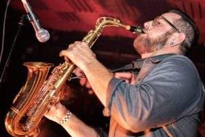 Saxophonist and vocalist of FTA Charlie McInnis performing at the Community album release show, December 28. Photo by Dalton Spangler.
