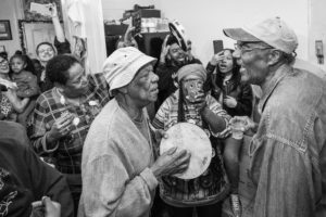 Monk Boudreaux 78th Birthday Party: Michelle Longino holding Lauren Boudreaux (Lawrence’s daughter), Jerry Moran, Trina Johnson, Monk Boudreaux, Joseph Boudreaux, Rukiya Brown (phone hiding her face), Tahj Williams, Yeti Boudreaux, Valence street and Magnolia Street, December 2019, photo by Erika Goldring