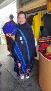 Returning to what Jazz Fest is all about in the best possible way, the Jazz Fest Culture Exchange for 2024 is with Colombia. This includes a dedicated stage with Colombian music, many of these same performers out on the regular stages, a tent focused on artists, and more. One of the artists this week was textile and fashion designer Flor Imbacuan Pantoja who is based out of Carlosama, Narino colony so far south in Colombia it’s steps from Ecuador. Ms. Flor learned the pre-Columbian loom “la Guanga” from her mother and has taken that to create contemporary fashions with ancestral techniques.
