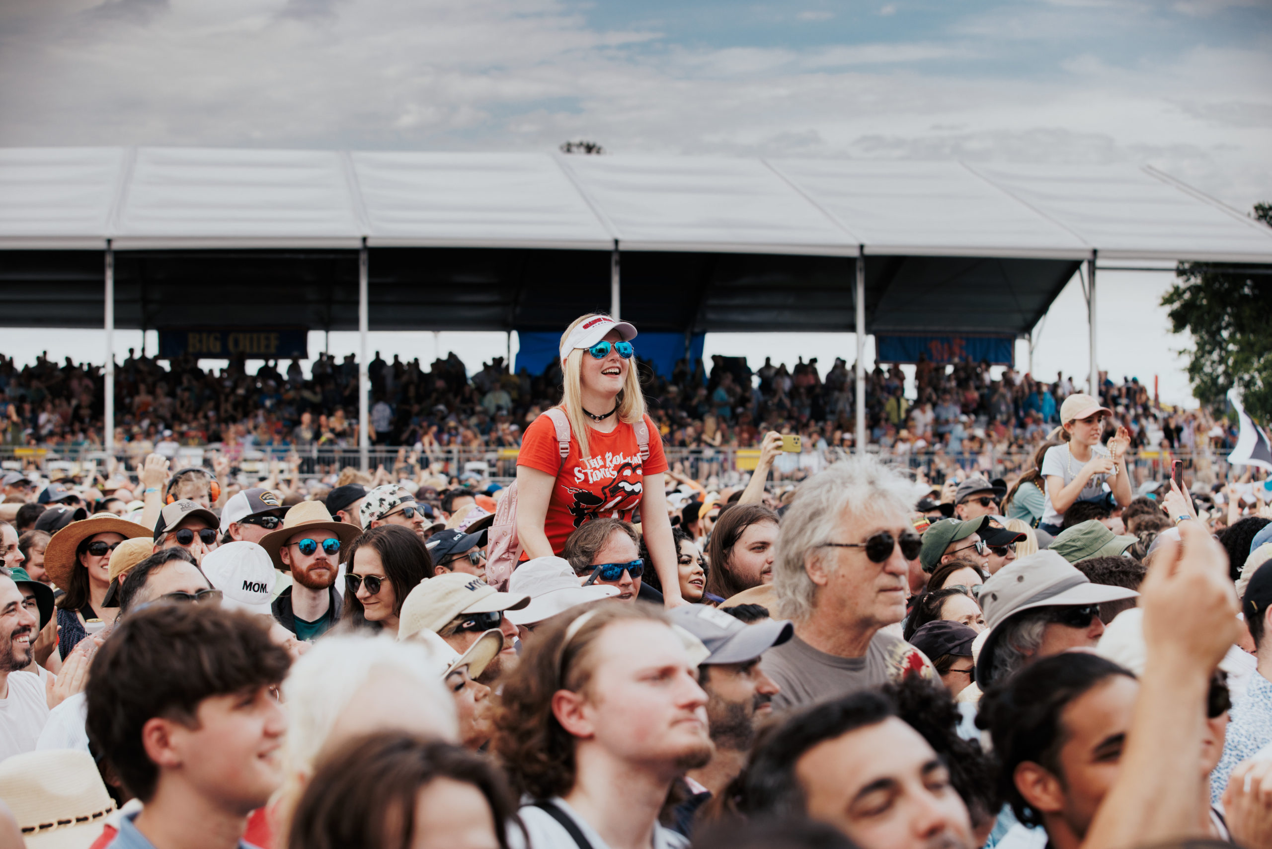 The biggest show of the 4 p.m. timeslot was unquestionably Allison Russell at the Blues Tent. All seats were taken moments after the previous act ended, although one man who snagged one turned to me and asked if I thought Russell was supposed to be “good.” In fact, the Montreal-born singer-songwriter, whom Joni Mitchell calls “the most beautiful clarinet player ever” drew them in not because of her looks but on the strength of last year’s brilliant The Returner, Russell’s second album, which won her first Grammy (out of eight nominations!). She got the crowd of diehard fans and newbies alike singing the word “demon” back to her from 2023s “Demons,” and earned herself a standing ovation when she brought out Hozier, who has the number one single on the Billboard Hot 100, to close with their duet, “Requiem.” It was a stunning performance of a stunning song, and inspired many to race over to the Gentilly stage an hour later for Hozier’s headline set, during which Russell returned the favor, duetting on their song “Wildflower and Barley,” from Hozier’s new EP.