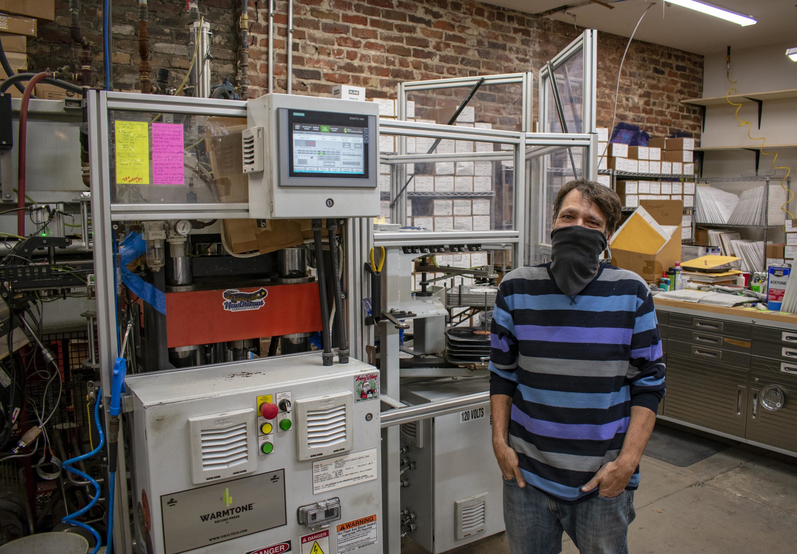 Eddie Bricker is a record press operator at New Orleans Record Press. He works at Sisters in Christ Records and was a silversmith before being hired at the press. Photo by Dalton Spangler.
