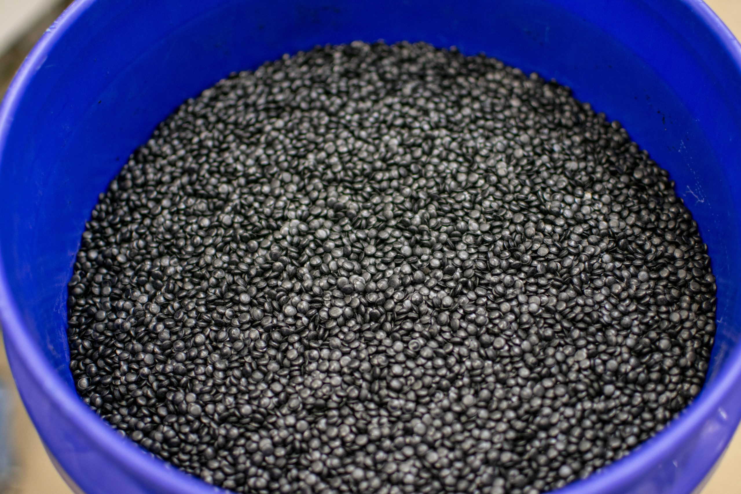 Polyvinyl chloride plastic is used in vinyl records, floors, clothes and more. The pellets are melted into heated pucks that are then pressed inside of a stamping machine. Photo by Dalton Spangler.