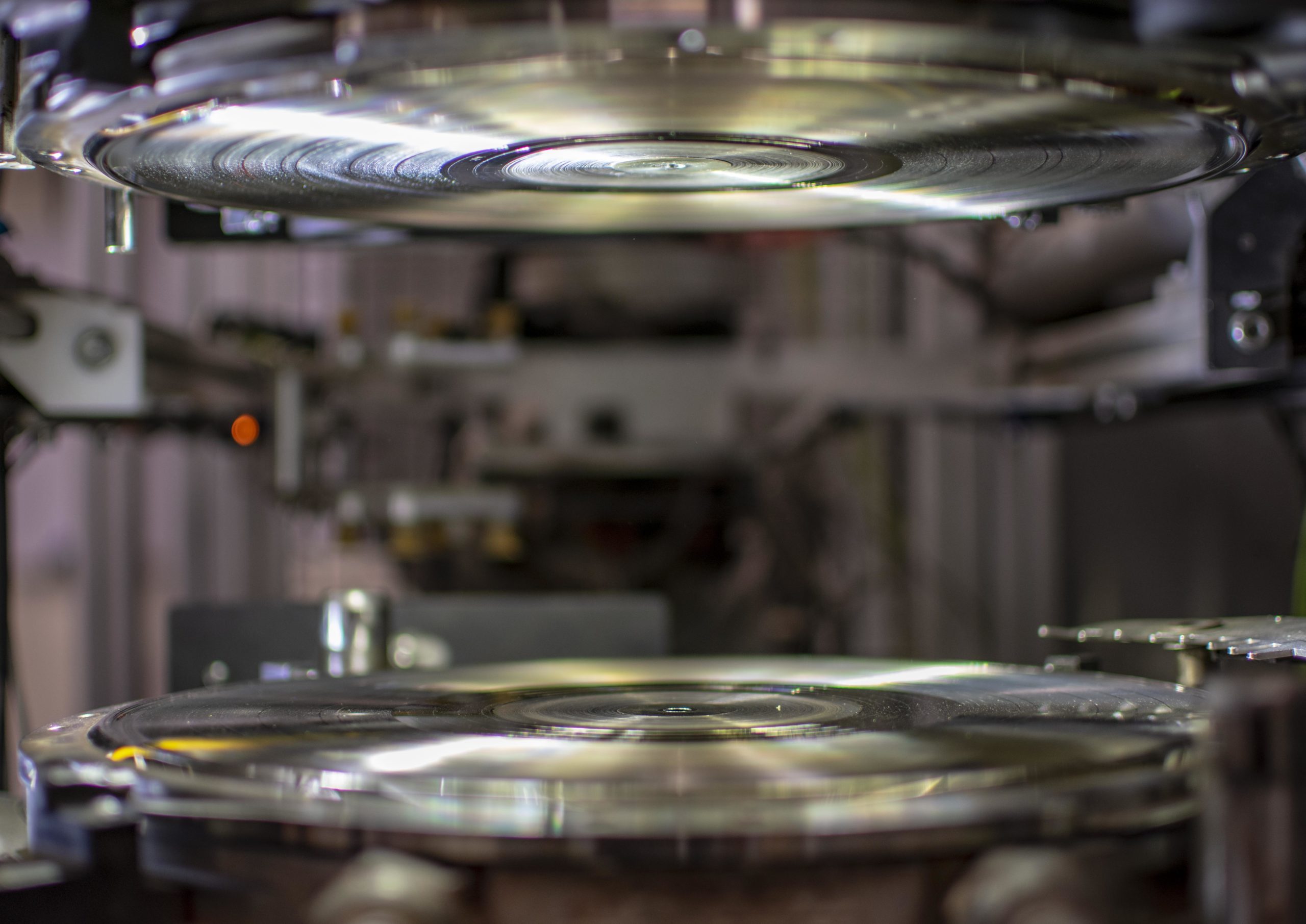 The inside of a record press has two stampers with microscopic grooves that make the vinyl plastic into a playable record. Photo by Dalton Spangler.