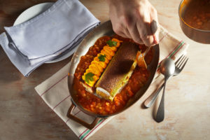 One dish that reflects this is the restaurant’s Gulf Fish “Court Bouillon,” served with oyster dressing and rouille (a thick, bread-enriched sauce that gets much of its flavor and color from saffron). Branighan explained that the dish is prepared with a classic court bouillon broth pureed with butter.