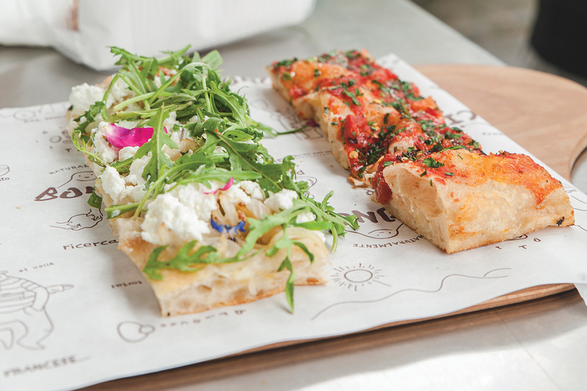 Emanating from the Prati district of Rome in the shadow of the Vatican, Gabriele Bonci’s revolutionary approach to pizza brought forth some 1,500 different topping variations. Hot off the heels of success in Chicago, Bonci Pizzeria has taken the Warehouse District in New Orleans by storm. The New Orleans branch is more streamlined, with just over two dozen offerings that will rotate seasonally. This unique Roman-style al taglio (by the cut) pizza is cooked in thin rectangular sheet pans, then sliced to order and sold by the pound, which offers diners the opportunity to sample many different variations. The pizza dough begins with a 200-year-old starter culture, organic heirloom einkorn farro semolina, whole spelt flour, extra virgin Italian olive oil, water, unbleached sea salt, and a pinch of brewer’s yeast. The dough goes through a day-long cold fermentation process that creates an airy, almost fluffy pizza similar but softer than focaccia, with wonderful crispiness.