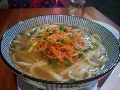 Finally, to warm my bones I opted for the “Spicy Dan Dan Noodles.” This is a large bowl of chicken and black bean and homemade chili sauces and it really hit the spot! The noodles are on the thicker side, so they do a good job of soaking up the yummy broth. Speaking of the broth, it already has a nice kick to it, but I liked that they brought a little extra chili sauce on the side, just in case you want to bring it to the next level. If you get this dish, be sure to stir it all well and let those ingredients really combine for the full flavor experience.