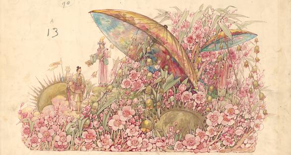 [caption id="attachment_256329" align="aligncenter" width="570" caption="Float design from Mistick Krewe of Comus 1912 parade, "Japan sends an embassy." Photo courtesy of the Carnival Collection, Louisiana Research Collection at Tulane University."]
