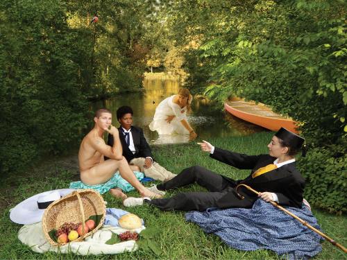 The photo was shot in New Orleans and Amsterdam and titled Ode to Manet’s Le Déjeuner sur l’Herbe. The woman on the right in the photo is Trixie Minx. The original painting also inspired the cover of one of British ‘80s new wave band Bow Wow Wow’s albums.