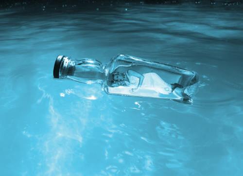 When I was very little, my father used to sail us out to remote islands off of North Carolina to picnic and collect treasures. These treasures would range from fresh scallops and beautiful shells to entire rabbit skeletons, sitting undisturbed as though ready to hop away. But my favorite treasures to find washed ashore were the old bottles. Often blue glass, and usually covered in barnacles, they spoke of exotic adventures out of the past, someone trapped somewhere; a message in a bottle. For some reason the vision of girls adrift at sea in bottles has been stuck in my head for the past two years. I finally decided I had to let them out of my head and onto paper. They seem like a dream to me: some resting, some daydreaming, some slightly troubled or even annoyed at their circumstances. They are the message in the bottle, the treasure and the trapped, mysterious person all in one. I have always loved the play in water, sometimes turbulent, sometimes looking like beautiful waves washing in from the Caribbean, and have incorporated that in my photos, letting the luminous mystery of the deep blue seas star equally. Although the photos seem to be from oceans worldwide, I call them my Mississippi Mermaids: besides loving the movie, they were all photographed here in New Orleans—and what other mermaid would travel in a bottle?