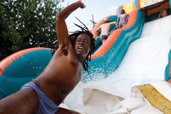 Soon after the slide was inflated, I captured Kevin Lawrence as he flew down the 12-foot water slide to the pool below. In the background are Frank and Jean-Eric bandmate Karen Wallace, each donning American-flag bathing suits and blowing lifeguard whistles to call people over to the slide. I think they were wearing the American-flag bathing suits out of ironic hipster patriotism.