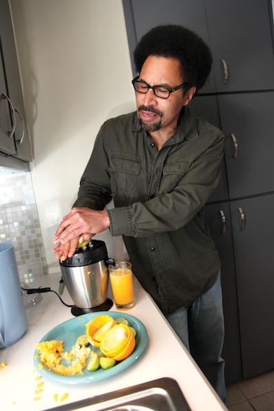 I keep a supply. I fill this container, which is probably 64 ounces. When it runs out, I do it again. I’ll go through it in two days, three days sometimes, depending on what’s going on. Then I make another one. If I’m too lazy, or just don’t have time to do it, then I’ll just eat an orange straight up. So I’m consuming citrus fruit just about every day. This is like a pleasure food for me. If I’m in the studio practicing, I’ll have a 16-ounce glass like this and sip on it., might do two of them.