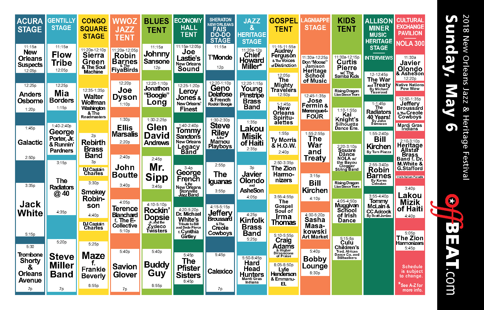 Jack White, Steve Miller Band, Smokey Robinson, Trombone Shorty & Orleans Avenue, Radiators @ 40, Maze featuring Frankie Beverly, Savion Glover, Buddy Guy, Rebirth Brass Band, Galactic, Anders Osborne, Ellis Marsalis, DJ Captain Charles, George Porter, Jr. & the Runnin’ Pardners, Lakou Mizik of Haiti, The Gospel Soul of Irma Thomas, The Iguanas, Walter Wolfman Washington & the Roadmasters, Calexico, Terence Blanchard featuring the E-Collective, Rockin’ Dopsie, Jr. & the Zydeco Twisters, Rising Dragon Lion Dance Team, New Orleans Suspects, The Zion Harmonizers, Geno Delafose & French Rockin’ Boogie, Glen David Andrews, Flow Tribe, Steve Riley & the Mamou Playboys, Hard Head Hunters Mardi Gras Indians, Young Pinstripe Brass Band, Mr. Sipp, Mia Borders, Jeffery Broussard & The Creole Cowboys, Bobby Lounge, Johnny Sansone, Dr. Michael White’s Tribute to Billie and Dee Dee Pierce featuring Cynthia Girtley, Kinfolk Brass Band, George French & the New Orleans Storyville Jazz Band, Prince of Wales and Original New Orleans Lady Buckjumpers Social Aid & Pleasure Clubs, The New Orleans Spiritualettes, Sasha Masakowski “Art Market”, Jonathon “Boogie” Long, The Heritage All Star Brass Band featuring Dr. Michael White and Gregg Stafford, Tommy Sancton’s New Orleans Legacy Band, The Pfister Sisters, Leroy Jones & New Orleans’ Finest, Wild Tchoupitoulas, Buffalo Hunters, and Wild Squatoulas Mardi Gras Indians, The War and Treaty, Ty Morris & H.O.W., Javier Olondo and AsheSon, Robin Barnes & The FiyaBirds, Bill Kirchen, Quiana Lynell, Chief Howard with the New Orleans Mardi Gras Indian Rhythm Section, Joe Dyson, T’Monde, Don “Moose” Jamison Heritage School of Music, Square Dance NOLA with the Bayou Clogger String Band, Audrey Ferguson & The Voices of Distinction, Sierra Green & The Soul Machine, Lyle Henderson & Emmanu-EL, Native Nations Intertribal, Sons of Jazz Brass Band, The Mighty Travelers, Jose Fermin & Merengue4-FOUR, Young Magnolias and Apache Hunters Mardi Gras Indians, Joe Lastie’s New Orleans Sounds, Craig Adams & Higher Dimensions of Praise, Culu Children’s Traditional African Dance Company, Da Knockaz Brass Band, Ole & Nu Style Fellas and Original C.T.C. Steppers Social Aid & Pleasure Clubs, Kai Knight’s Sihouette Dance Ensemble, Curtis Pierre with The Samba Kids, and the Muggivan School of Irish Dance.
