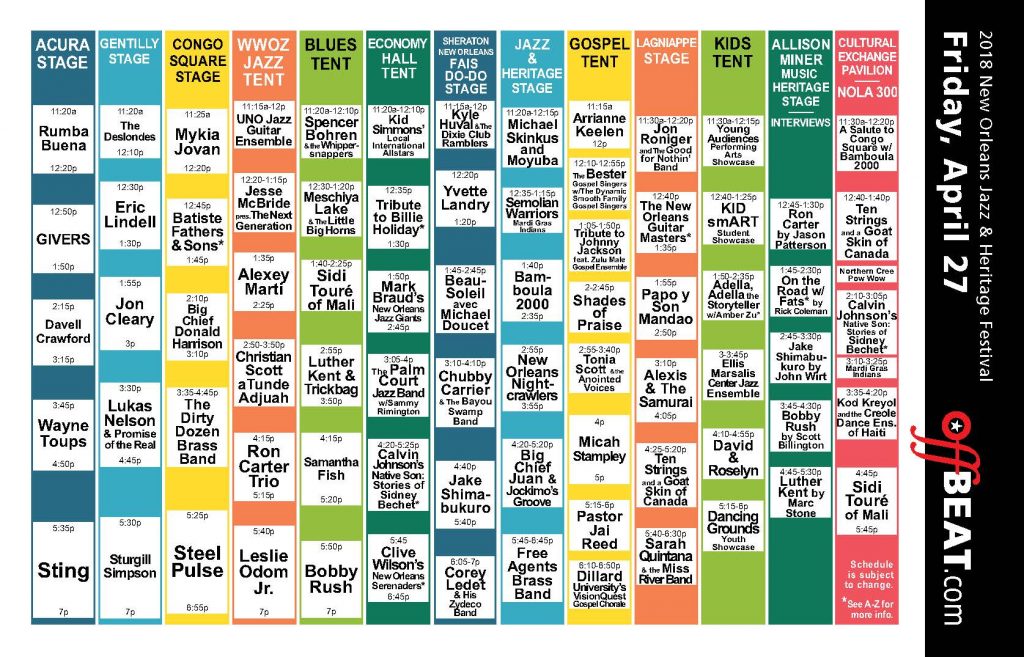 Sting, Sturgill Simpson, Steel Pulse, Lukas Nelson & Promise of the Real, Ron Carter Trio, The Dirty Dozen Brass Band, Jon Cleary, Samantha Fish, Davell Crawford, Jake Shimabukuro, Wayne Toups, Luther Kent & Trickbag, Bobby Rush, Leslie Odom Jr., Eric Lindell, Sidi Toure of Mali, BeauSoleil avec Michael Doucet, Big Chief Donald Harrison, Christian Scott aTunde Adjuah, Chubby Carrier & the Bayou Swamp Band, Ten Strings And A Goat Skin of Canada, Meschiya Lake & the Little Big Horns, New Orleans Nightcrawlers, Zulu Gospel Ensemble, Semolian Warriors Mardi Gras Indians, The Palm Court Jazz Band with Sammy Rimington, New Wave Brass Band, Rumba Buena, Batiste Fathers & Sons, The Deslondes, Shades of Praise, Yvette Landry, Free Agents Brass Band, Alexey Marti, Micah Stampley, Spencer Bohren & the Whippersnappers, Corey Ledet & His Zydeco Band, Golden Sioux and Black Seminoles Mardi Gras Indians, Kod Kreyol and the Creole Dance Ensemble of Haiti, Clive Wilson’s New Orleans Serenaders with Butch Thompson, Sarah Quintana & the Miss River Band, Papo y Son Mandao, Bamboula 2000, Pastor Jai Reed, The New Orleans Guitar Masters feat. Cranston Clements, John Rankin, and Jimmy Robinson, The Ellis Marsalis Center for Music Jazz Ensemble, Tonia Scott & the Anointed Voices, Big Chief Juan & Jockimo’s Groove, Tribute to Billie Holiday with Sharon Martin & Company, Northern Cree of Canada, Kyle Huval & the Dixie Club Ramblers, We Are One, Perfect Gentlemen, and Keep N It Real Social Aid & Pleasure Clubs, Michael Skinkus and Moyuba, Jon Roniger & The Good for Nothin’ Band, Shake ‘Em Up Jazz Band, Jesse McBride presents The Next Generation, The Bester Gospel Singers, The Dynamic Smooth Family Gospel Singers, David & Roselyn, Arrianne Keelen, Mykia Jovan, Dillard University’s VisionQuest Gospel Chorale, Free Spirits Brass Band, Go Getters and Big Nine Social Aid & Pleasure Clubs, Calvin Johnson’s Native Son – Stories of Sidney Bechet feat. Aurora Nealand and Brian “Breeze” Cayolle, Dancing Grounds Youth Showcase, University of New Orleans Jazz Allstars, Kid Simmons’ Local International Allstars, KID smART Student Showcase, Ladies of Unity LLC, Wild Apaches, Black Mohawk, and Black Foot Hunters Mardi Gras Indians, Young Audiences Performing Arts Showcase, and Adella Adella the Storyteller.