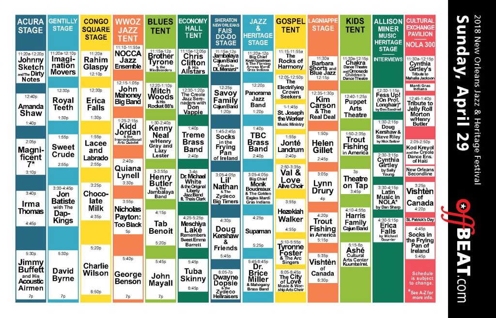 Beck, Sheryl Crow, LL Cool J, Jason Isbell and The 400 Unit, Aaron Neville, Preservation Hall Jazz Band, Tank & The Bangas, Ruthie Foster, Marcia Ball, Marcus Miller with special guest Rahsaan Patterson Celebrate Al Jarreau, Hiss Golden Messenger, Little Freddie King Blues Band, Nathan & the Zydeco Cha-Chas, Darcy Malone & The Tangle, Sunpie & the Louisiana Sunspots, Zachary Richard, The Soul Rebels, C.J. Chenier & the Red Hot Louisiana Band, Lil’ Buck Sinegal’s Blues Band with special guest Barbara Lynn, New Orleans Hip Hop Experience Feat. Fiend, 3D Natee, a New Orleans Cypher, DJ Keith Scott, and Cool Nasty Band, Jupiter & Okwess of the Democratic Republic of Congo, Bruce Daigrepont Cajun Band, James Andrews & the Crescent City All Stars, Glen David Andrews and the Treme Gospel Choir, CC Adcock + The Lafayette Marquis, Avalon Jazz Band, Don Vappie’s Tribute to King Oliver, Motel Radio, Germaine Bazzle, Morning Star Missionary Baptist Church Mass Choir, Wess Anderson Quintet, New Breed Brass Band, Mark Braud’s New Orleans Jazz Giants, Stars of Heaven, Big Chief Bird & the Young Hunters Mardi Gras Indians, Hot Club of New Orleans, Herbert McCarver & the Pin Stripe Brass Band, Sean Bruce, The Tumbling Wheels, New Orleans Jazz Orchestra, The Nth Power, Players Ella and Louie Tribute Band, Naydja Cojoe & the Lagniappe Section, Plaquemine Brulee, Doreen’s Jazz New Orleans, Maggie Bell Band, JIVA-NOLA featuring Mehnaz Hoosein & Andrew McLean, Brian Seeger Organ Trio, Betty Winn & One A-Chord, New Leviathan Oriental Fox-Trot Orchestra, Da Souljas Brass Band, Original Four, and Original Big 7 Social Aid & Pleasure Clubs, The Pure’D Blues Group feat. Butch Mudbone, Golden Comanche and Young Cherokee Mardi Gras Indians, Glenn Hartman & The Earthtones present Polka and Cajun Connection, The Swing Setters, Josh Kagler & Harmonistic Praise Crusade, Kumasi, John Lawrence and Ven Pa’ Ca Flamenco with guest Antonio Hildago of Spain, 79rs Gang Mardi Gras Indians, Donald Lewis, Native Nations Intertribal, Topsy Chapman & Solid Harmony, The Gospel Inspirations of Boutte, Young Eagles and Algiers Warriors Mardi Gras Indians, Caren Green & Cornbread, Tipitina’s Interns under the direction of Donald Harrison, Jr., The New Orleans Baby Doll Ladies, Kumbuka African Dance & Drum Collective, Pastor Terry Gullage & the Greater Mt. Calvary Voices of Redemption, Gray Hawk presents Native American Lore, New Generation Brass Band, Scene Boosters and Lady & Men Rollers Social Aid & Pleasure Clubs, Lake Forest Charter Jazz Ensemble, and Pastor Tyrone Jefferson.