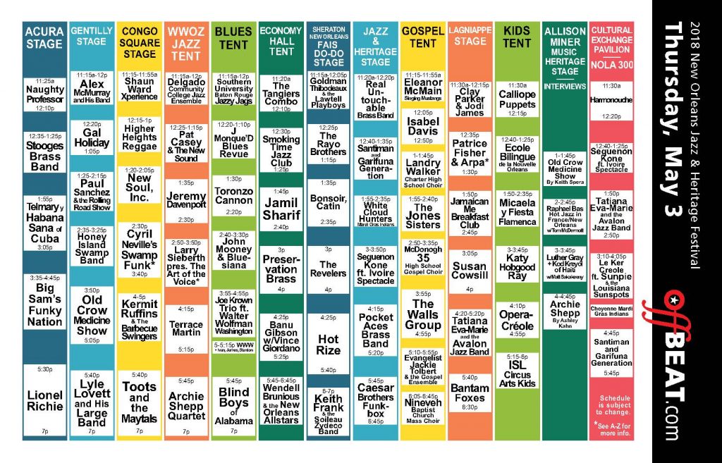 Lionel Richie, Toots & The Maytals, Lyle Lovett and his Large Band, Old Crow Medicine Show, Blind Boys of Alabama, Kermit Ruffins & the Barbecue Swingers, Big Sam’s Funky Nation, Telmary y Habana Sana de Cuba, Archie Shepp Quartet feat. vocalist Marion Rampa, Cyril Neville’s Swamp Funk featuring Omari Neville & The Fuel, Susan Cowsill, Hot Rize, Honey Island Swamp Band, Jeremy Davenport, John Mooney & Bluesiana, Stooges Brass Band, Hot Jazz of France with Avalon Jazz Band, Joe Krown Trio featuring Walter Wolfman Washington, Banu Gibson with guest Vince Giordano, The Roots of Music Marching Crusaders, Le Ker Creole featuring Sunpie & the Louisiana Sunspots, Real Untouchable Brass Band, Keith Frank & the Soileau Zydeco Band, Gal Holiday, Jamaican Me Breakfast Club, Patrice Fisher & Arpa with guests from Guatemala, Seguenon Kone & Ivoire Spectacle, Evangelist Jackie Tolbert & the Gospel Ensemble, J. Monque’D Blues Revue, OperaCreole, Santiman and Garifuna Generation, Caesar Brothers FunkBox, Goldman Thibodeaux & the Lawtell Playboys, Cheyenne and 7th Ward Hunters Mardi Gras Indians, Terrace Martin, Pocket Aces Brass Band, Toronzo Cannon, The Walls Group, The Chosen Ones Brass Band, VIP Ladies, Men of Class, and New Generation Social Aid & Pleasure Clubs, Raphael Bas and Harmonouche, The Jones Sisters, Wendell Brunious & the New Orleans Allstars, Preservation Brass, Larry Sieberth presents The Art of the Voice with Tonya Boyd-Cannon, Yolanda Robinson, and JarellB, Bantam Foxes, Naughty Professor, New Soul Inc., Higher Heights Reggae, The Revelers, Jamil Sharif, Alex McMurray and His Band, Pat Casey and the New Sound, Shaun Ward Xperience, Bonsoir, Catin, The Rayo Brothers, The Tangiers Combo, Nineveh Baptist Church Mass Choir, Isabel Davis, White Cloud Hunters Mardi Gras Indians, SUBR Jazzy Jags, McDonogh 35 High School Gospel Choir, Eleanor McMain Singing Mustangs, Micaela y Fiesta Flamenca, Native Nations Intertribal, Smoking Time Jazz Club, Katy Hobgood Ray, Clay Parker and Jodi James, Sporty’s Brass Band, Revolution, Sudan, and Men Buckjumpers Social Aid & Pleasure Clubs, Delgado Community College Jazz Ensemble, Landy Walker Charter High School Choir, ISL Circus Arts Kids, Calliope Puppets, and Ecole Bilingue of New Orleans.