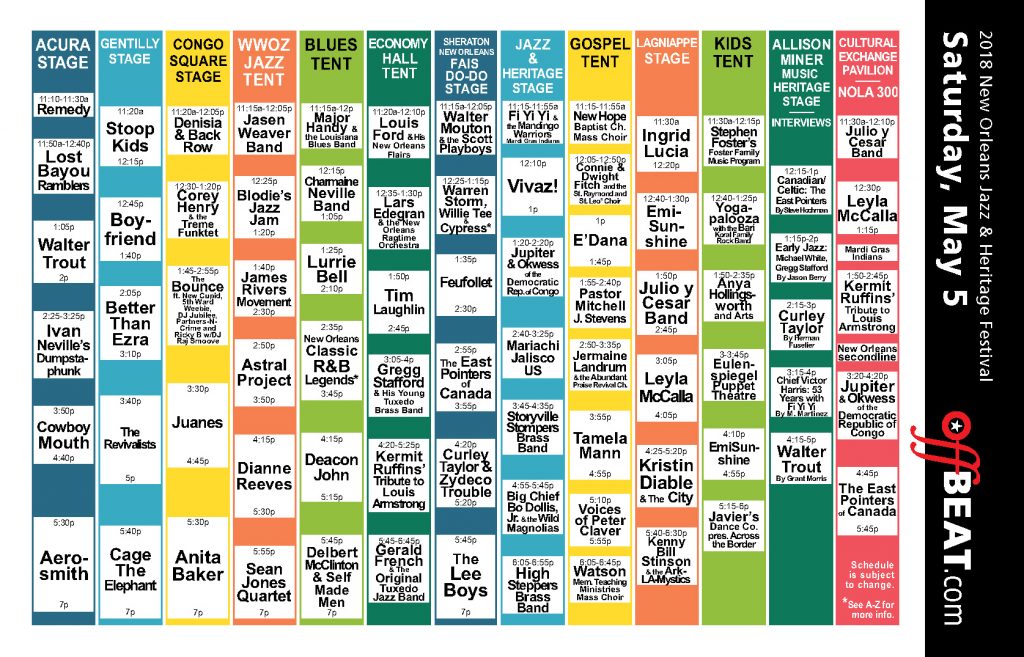 Aerosmith, Anita Baker, Cage the Elephant, The Revivalists, Juanes, Delbert McClinton & Self Made Men, Dianne Reeves, Ivan Neville’s Dumpstaphunk, Better Than Ezra, The Bounce feat. Cupid, 5th Ward Weebie, DJ Jubilee, Partners-N-Crime, Ricky B with DJ Raj Smoove, Tamela Mann, Deacon John, Cowboy Mouth, Boyfriend, New Orleans Classic R&B Legends featuring The Dixie Cups, Clarence “Frogman” Henry, Wanda Rouzan, and Al “Carnival Time” Johnson with Bobby Cure & the Poppa Stoppas, Kermit Ruffins’ Tribute to Louis Armstrong, Walter Trout, The Lee Boys, GIVERS, The East Pointers of Canada, Jupiter & Okwess of the Democratic Republic of Congo, Big Chief Bo Dollis, Jr. & The Wild Magnolias, Jermaine Landrum & The Abundant Praise Revival Choir, James Rivers Movement, Lost Bayou Ramblers, Lurrie Bell, Gregg Stafford & His Young Tuxedo Brass Band, Feufollet, Charmaine Neville Band, Warren Storm – Willie Tee & Cypress Band with guests T.K. Hulin and Gregg Martinez, Corey Henry & Treme Funktet, Stoop Kids, Astral Project, Tim Laughlin, Kristin Diable & The City, Leyla McCalla, Sean Jones Quartet, EmiSunshine, Marachi Jalisco US, Blodie’s Jazz Jam, Curley Taylor & Zydeco Trouble, Ingrid Lucia, Fi Yi Yi & the Mandingo Warriors, Storyville Stompers Brass Band, Westbank Steppers, Nine Times Ladies, and Valley of Silent Men Social Aid & Pleasure Clubs, Watson Memorial Teaching Ministries Mass Choir, Smitty Dee’s Brass Band, Lars Edegran & the New Orleans Ragtime Orchestra, Julio y Cesar Band, Vivaz!, Kenny Bill Stinson & the Ark-LA-Mystics, Connie & Dwight Fitch with the St. Raymond & St. Leo the Great Choir, Gerald French & The Original Tuxedo Jazz Band, Voices of Peter Claver, Major Handy & the Louisiana Blues Band, Denisia & Back Row, Jasen Weaver Band, Highsteppers Brass Band, Trouble Nation and Mohawk Hunters Mardi Gras Indians, E’Dana, Louis Ford & His New Orleans Flairs, Native Nations Intertribal, Yogapalooza with the Bari Koral Family Rock Band, Anya Hollingsworth, Pastor Mitchell J. Stevens, New Hope Baptist Church Mass Choir, Walter Mouton & the Scott Playboys, Stephen Foster’s Foster Family Music Program, Young Fellaz Brass Band, Lady Jetsetters, Undefeated Divas & Gents, and Original Pigeon Town Steppers Social Aid & Pleasure Clubs, Javier’s Dance Company presents Across the Border, Wild Red Flame, Uptown Warriors, and Young Brave Hunters Mardi Gras Indians, and the Eulenspiegel Puppet Theatre.