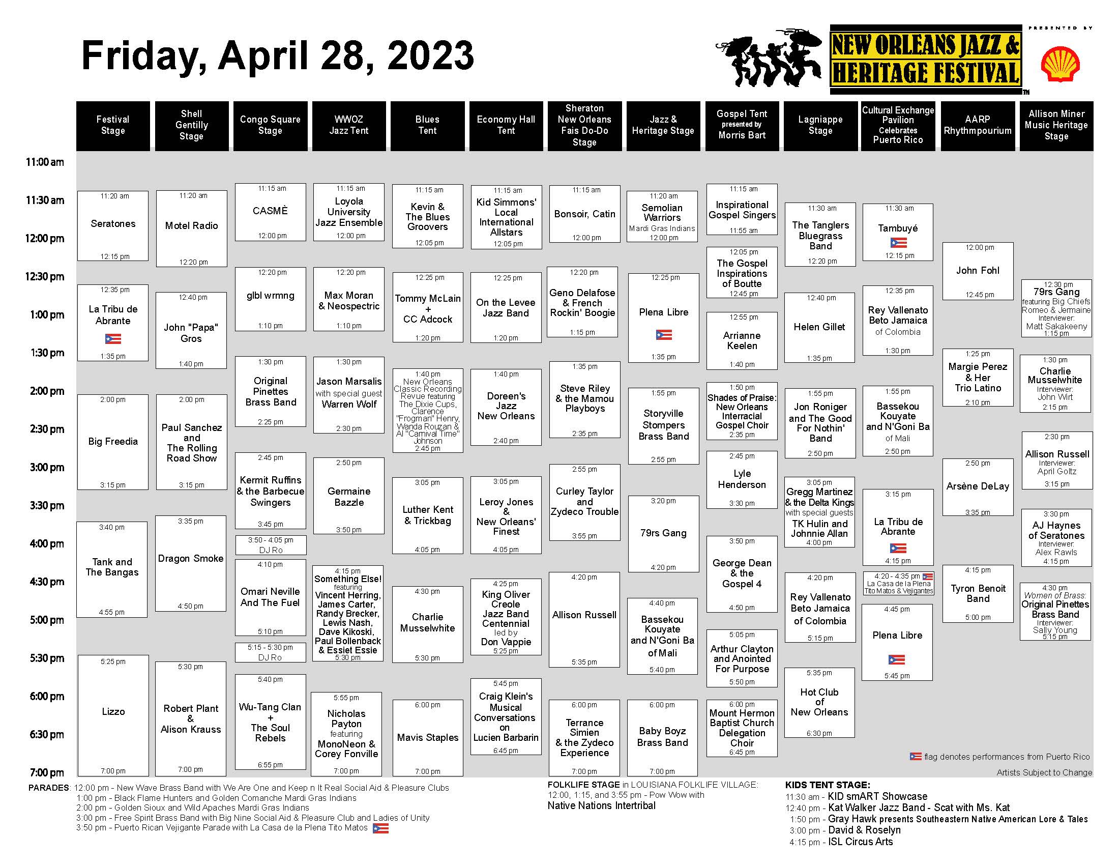 | Wild Mohicans and Wild Tchoupitoulas Mardi Gras Indians | 5/5 | PAR | 1:10p | A family tribe founded in 1996 led by Big Chief Kentrell and Big Queen Zen. |