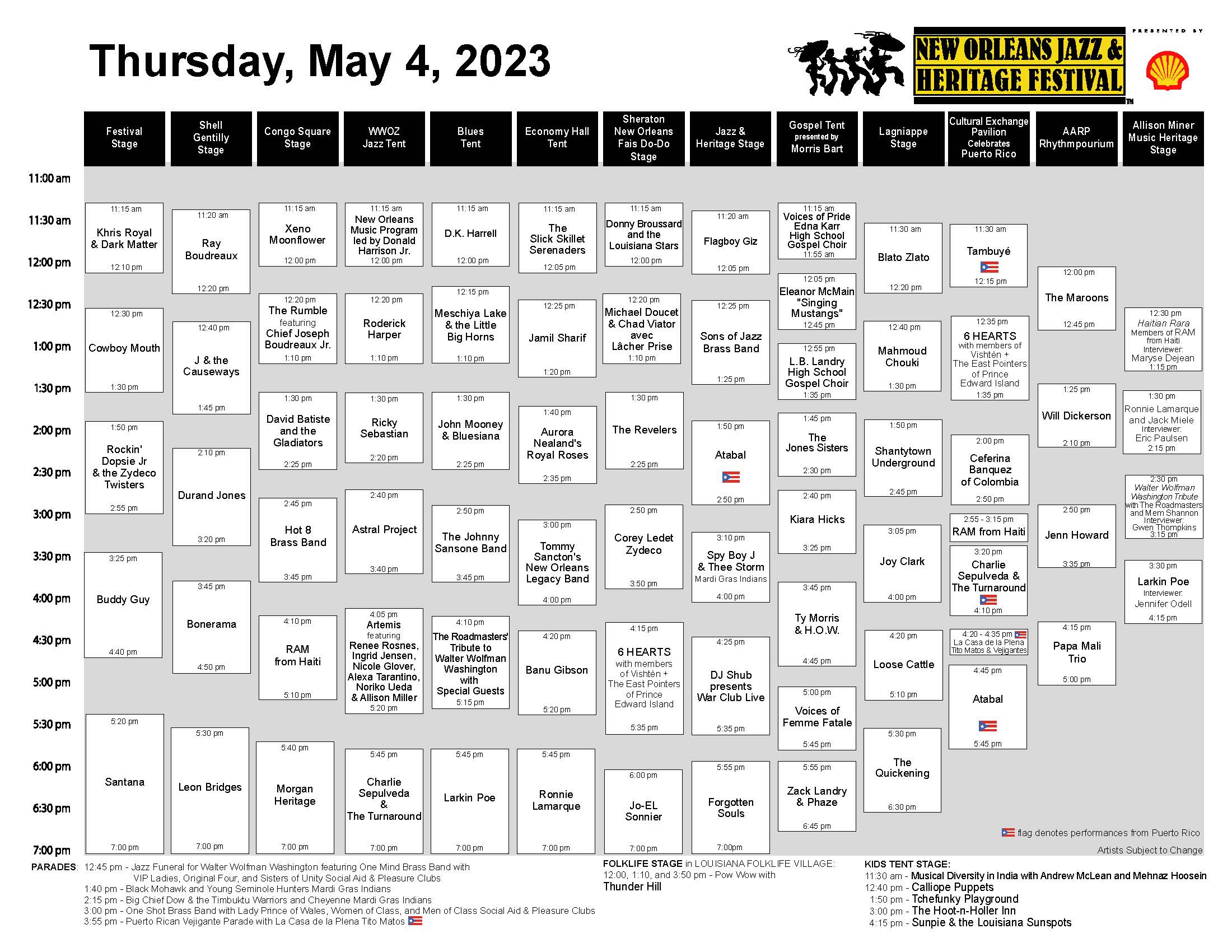 | The Rocks of Harmony | 5/5 | GOS | 11:45a | New Orleans gospel in its purest form, this all-male group has been singing praises and spirituals for a half-century. |