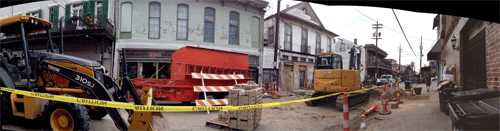 Secondly, there’s a problem with the way construction and water work is contracted in New Orleans. The S&WB wasn’t the party who didn’t get the job done (although they did have an inspector present). I found out that the reason the street was dug up was that the Laborde property—which is now supposed become only a restaurant, not a music venue—is required to include a sprinkler system, and the water supply wasn’t adequate to complete the job. The contractor hired by the developer of the property (remember “Bamboula”?) hired a general contractor, who in turn had to hire a sprinkling contractor who had to hire a plumbing contractor to do the work. The way I understand it is that whenever there’s a “street cut” involved, the process is put out to bid and the contractor has the option to choose the lowest bidder. By the way, the S&WB can put in a bid as well, but if a bid comes in lower, the S&WB may be excluded as a contractor (in this case, it was; a private contractor did the job). The contractor who was doing this job happened to dig too deep and broke a main pipe. Well, accidents happen. They could happen to anyone who was doing the job. But, if the job was done on days and times that Frenchmen Street wasn’t busy, there would have been a lot more leeway to get the job finished in a way that wouldn’t affect those businesses on the street.