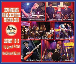 Local favorites Ghalia Volt, Cigar Box Serenaders, Mahmoud Chouki, Ed Wills and Blues 4 Sale, Rumsey Kadar, and Amzie Adams will represent New Orleans’ vibrant music scene. Additionally, Nashvillian blues powerhouse Meg Williams, April Mae and the June Bugs (New Jersey), Memphis Lightning (Florida) and global CBG ambassador Steve Arvey will join the festivities.