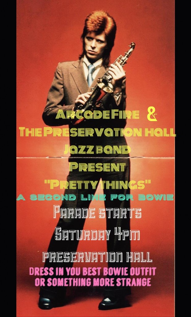 Arcade Fire and the Preservation Hall Jazz Band will team up to lead a second line for David Bowie this Saturday, January 16.