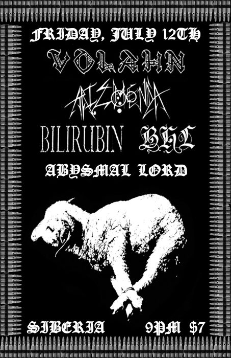 Friday night’s bill consists of bands from the Black Twilight Circle, a shadowy and mysterious union of mostly- California bands who are, they say, “bound to chaos worship through extreme arts and ritual.” The bands release discs on their collectively run Crepusculo Negro label; interviews and personal appearances are rare. Volhan, who composes for and plays with numerous bands in the circle, told this to a Boston Phoenix writer in 2011: “The early days were intoxicating hallucinations of violence, drugs, hatred, prejudice, struggle, and learning the ways of occult ritual. Black Twilight is our means of limitless expression and the purest disorder.” Friday’s show will include Volhan and fellow Circle members Arizmenda, Bilirubin, and Blue Hummingbird on the Left; plus the debut of like-minded New Orleans band Abysmal Lord.