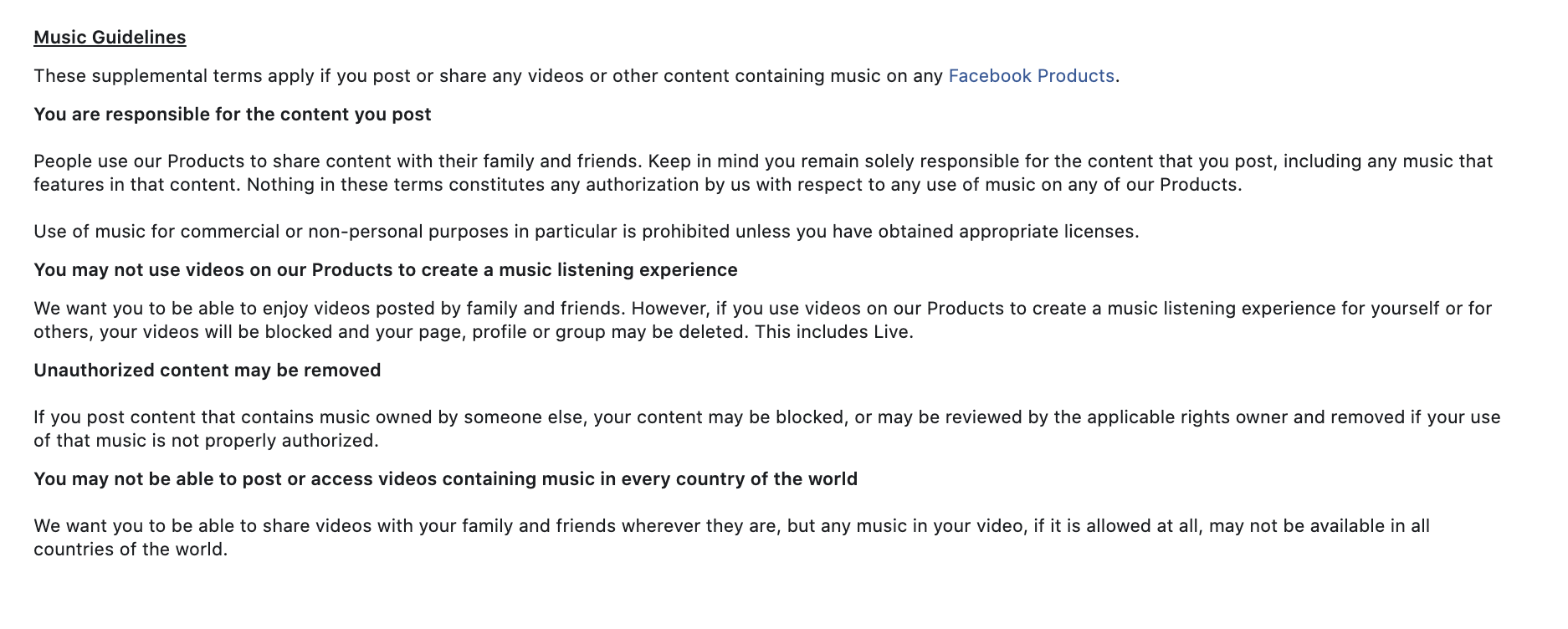 A Facebook spokesperson told the British music magazine NME in September “although new guidelines will come into effect across the site in October, the music guidelines have been in place for some time and will not affect artists using the site to livestream gigs or share their music.”