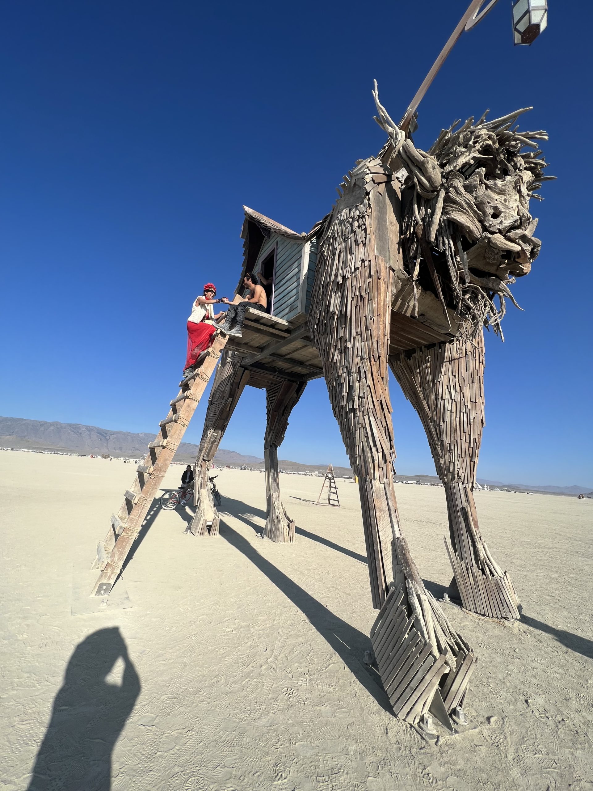 What does climate change have to do with all this? Burning Man is about the journey. It could be an epiphany in your life. If you fly in to Burning Man, (yes, there is an airport!), you lose a very important portal into the growth process. It’s like a flower without a stem. Burning Man is a lesson and a challenge. I drove to Burning Man this year in a cargo van. I’ve crossed the United States so many times in a vehicle I have lost count, but this trip was a jaw-opener. I had four days of traveling in over 110° temperatures. I saw three 53-foot-long semis engulfed in flames, not because of collisions, but because of self-implosion. I saw numerous active brush fires on the side of the road plus the scorched land of previous fires, and then I went through a hurricane in California. And topped it off with epic floods on the playa. The activity of the oil companies to push for more and more product is nauseating. Pay attention. Do everything you can to be a good steward of the Earth!