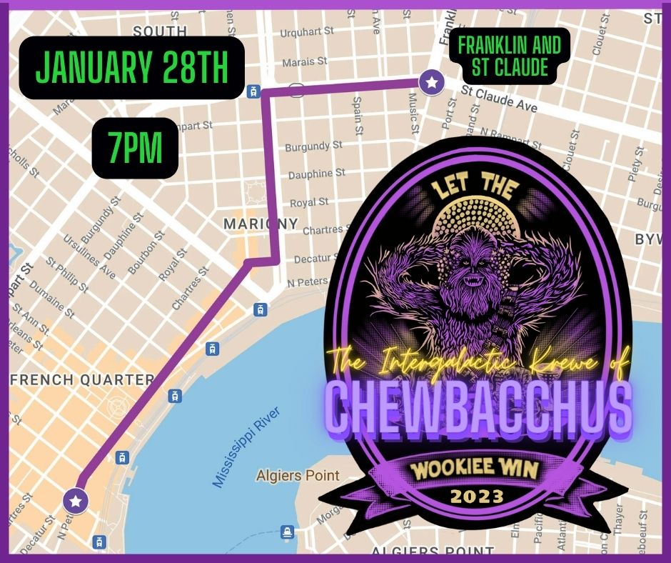 Chewbacchus’ route is slightly altered this year returning to the edge of the Bywater. The new route begins at Franklin and St. Claude Avenues before proceeding down St. Claude (riverside), turning left on Elysian Fields, right on Decatur, and then continuing along Decatur until it turns into N. Peters. The parade ends at N. Peters and Conti.