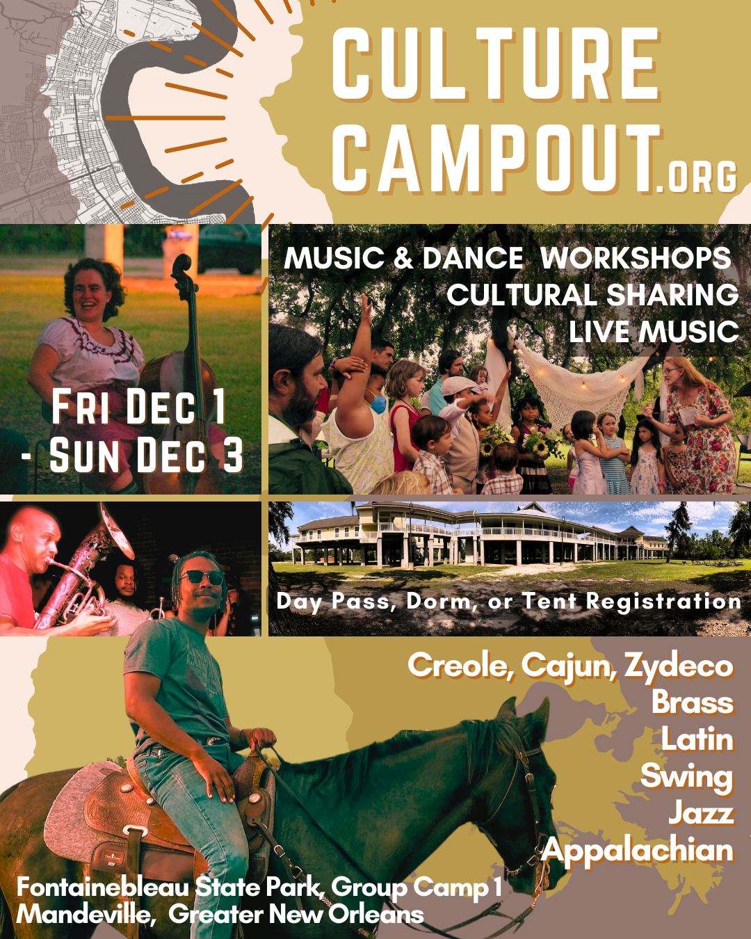 Don’t miss the 1st Annual Culture Campout weekend Friday December 1-Sunday Dec 3. The event promises to be a memorable weekend of music, dance, food , workshops and culture featuring: Sun Pie Barnes, Margie Perez, Jeffrey Broussard and the Nightime Syndicate, Music Machine Brass Band, Nola Square Dance, Mariachi Moderno Internacional, T Marie and Bayou Juju, Ian Monroe, Bad Penny Pleasuremakers, Louisiana Dance Roots, Joshua Hernandez, Drake Leblanc, Bryant Watson, and more!