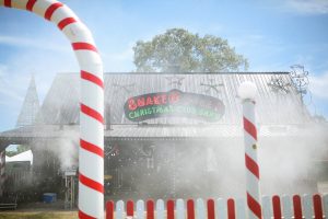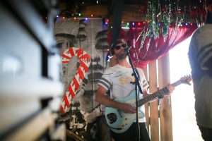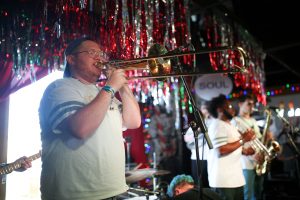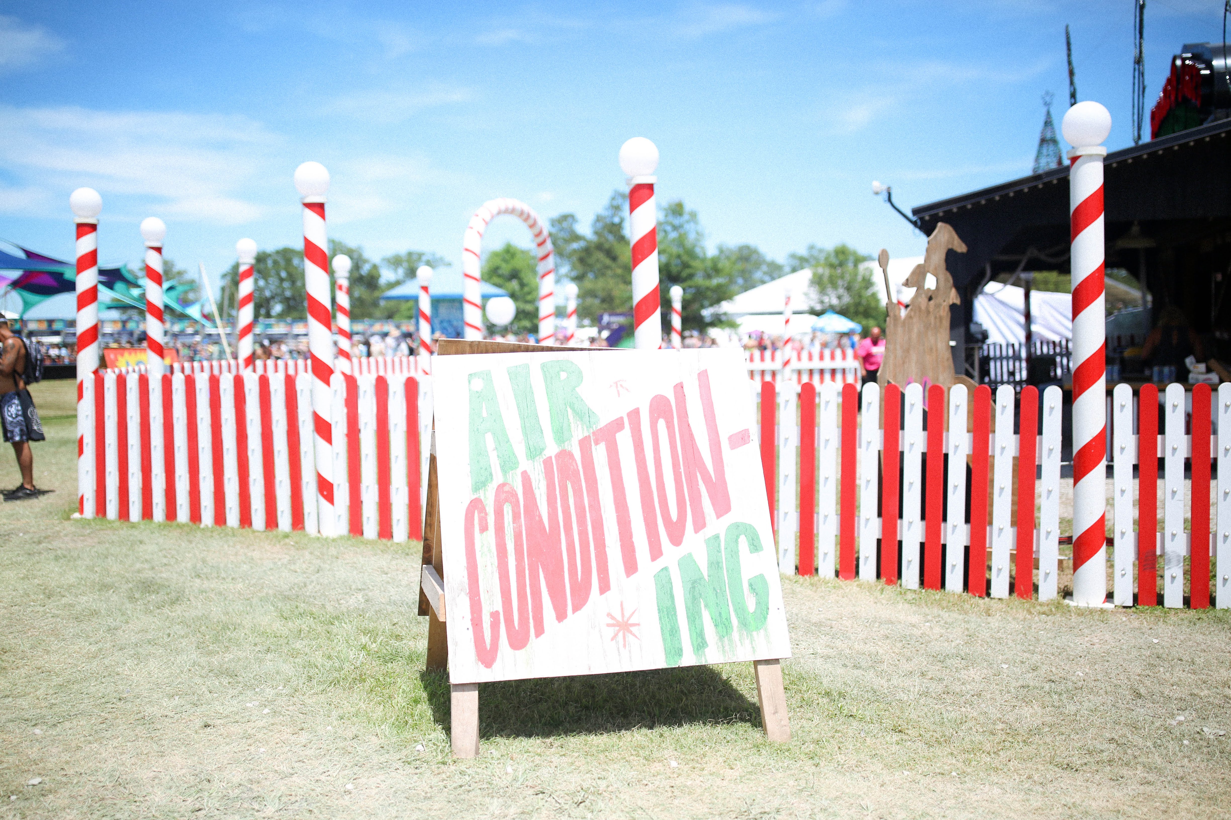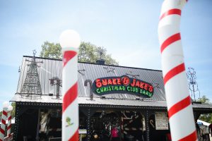 Our first stop on the festival grounds, naturally, was the Snake & Jake’s Christmas Club Lounge, a retrofitted barn inspired by New Orleans’ beloved dive. It was still early afternoon, a strange time of day to be standing outside Snake’s (the Carrollton bar is only open from 7 p.m. until 7 a.m.). Another stark difference was the price of beer. The $3 Miller High Life I usually ask my favorite barkeep, Juan, to send generously in my direction was replaced by $7 PPR. But once the music started playing, it wasn’t so bad. Plus, they had peppermint-scented “snow” pumping into the barn’s front yard, lending the sweet, minty scent of Christmastime to what was otherwise a sweltering hellhole.