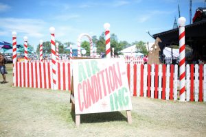 We began heading towards the media tent, eager to take advantage of clean(er) bathrooms and WiFi. It was a real exercise in spacial recognition trying to locate the damn thing, which existed in a Bermuda Triangle without any distinguishing signage whatsoever. We eventually got our bearings while memorizing where which stage was. Barely. With names like the Where Stage, Who Stage, What Stage and Which Stage, we were primed for the absurd. After about an hour of bouncing back and forth across the farm, we located the media tent in all her air conditioned glory.