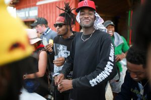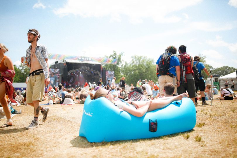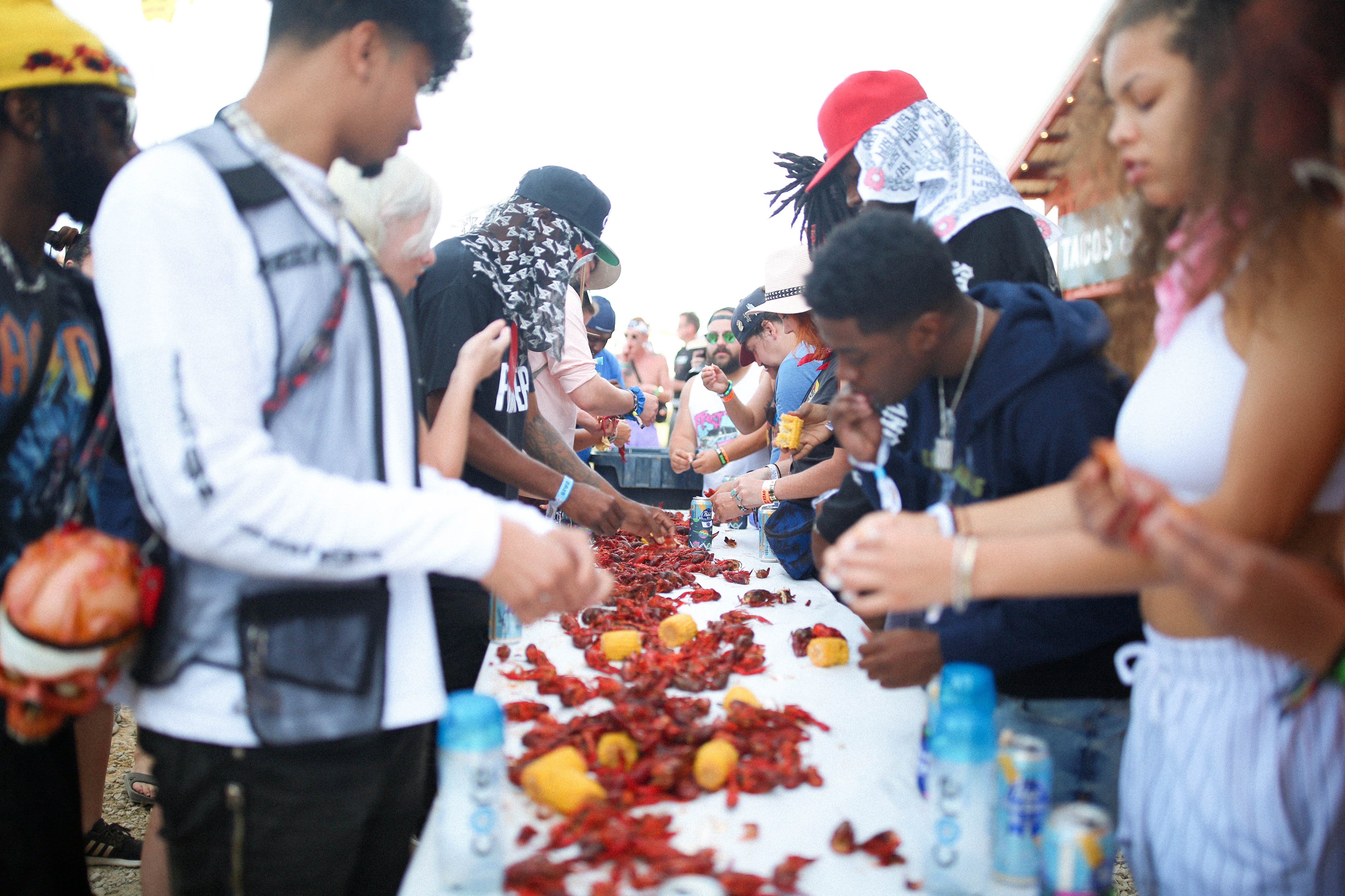 We ventured back to Bayou Libre (a 20-minute walk past tents and more tents and more tents), eager to arrive in time for FREEWATER’s daily, free crawfish boil. There, rappers Neno Calvin and Malik Ninety Five were joined by New Orleans DJs Lil Jodeci and G-Cue for the feast, which covered two long tables and included traditional New Orleans boil fare – mudbugs, corn and potatoes. The camping plaza was decorated to look like a swamp, complete with an alligator on stage, tree stumps and a rubber dinghy. Programming at Bayou Libre included Move Ya Brass twerking classes with Jenny Leigh, a performance from rapper Lil Debbie and more.
