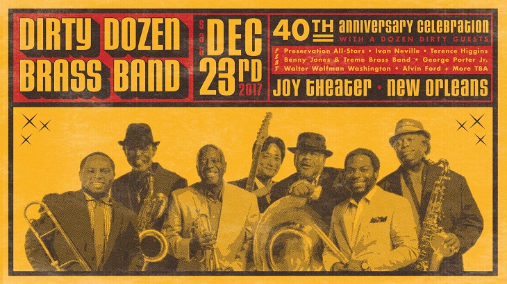 The Dirty Dozen Brass Band 40th Anniversary Celebration takes place Saturday, December 23 at the Joy Theater (1200 Canal St.). In addition to the men of the hour, the event will feature performances from Preservation All-Stars, Ivan Neville, Benny Jones & Treme Brass Band, George Porter, Jr., Walter “Wolfman” Washington, Terence Higgins, Alvin Ford and more to be announced.