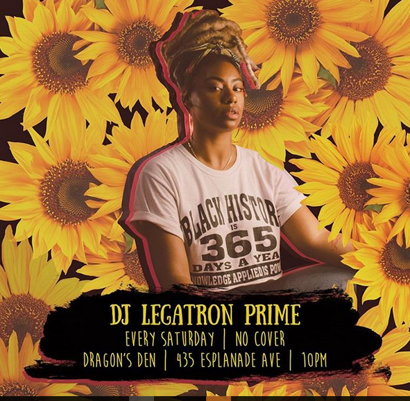 You can catch a bit of DJ Legatron Prime’s Black Girl Magic every Saturday at 10 p.m. at The Dragon’s Den (435 Esplanade Avenue). No cover.