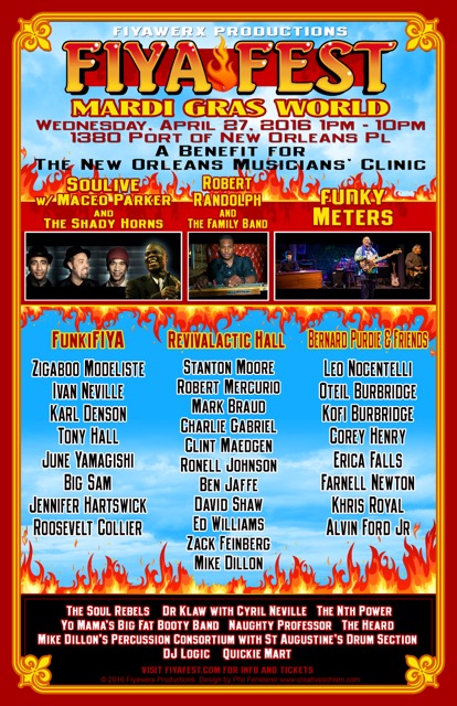 Also performing at Fiya Fest will be The Soul Rebels, Dr. Klaw with Cyril Neville, The Nth Power, Yo Mama’s Big Fat Booty Band, Naughty Professor, The Heard, Mike Dillon’s Percussion Consortium with the St. Augustine Drum Section, DJ Logic, and Quickie Mart.
