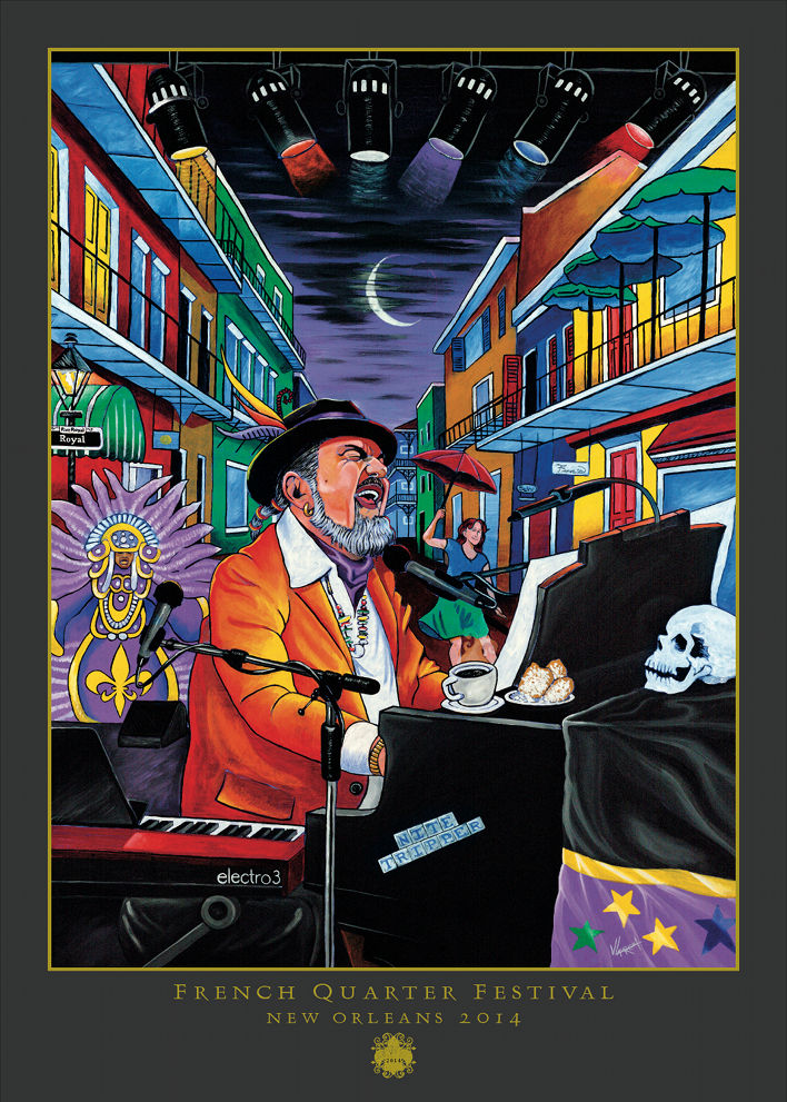 The 2014 line-up’s marquee performance will be Dr. John‘s first appearance at French Quarter Fest since 1987. Organizers note that Mac’s French Quarter Fest set is he and the Nite Trippers only spring festival performance for 2014, and is to be followed by a closing performance by the Roots of Music youth marching band (beneficiary of the FQF Gala fundraiser and last April’s OffBeat Magazine cover story) and the Grammy Award-winning Rebirth Brass Band, making the evening a not-to-be-missed event. This year’s official festival poster, created by local artist Varion Laurent, also pays homage to Dr. John as its 2014 subject. The poster is available for pre-order now on the French Quarter Fest website.
