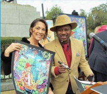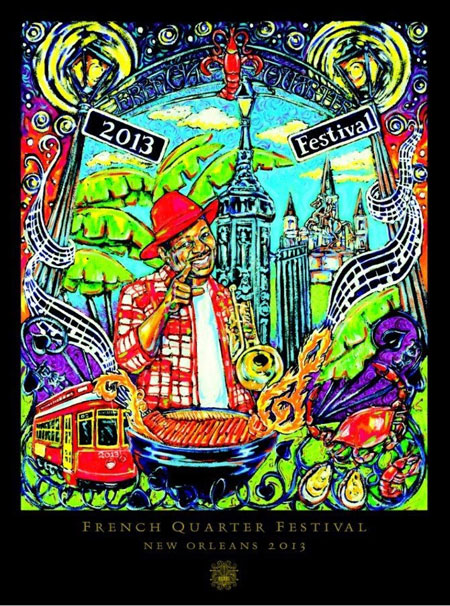 A lot of people admired and bought copies of this year’s French Quarter Festival poster, which featured Kermit Ruffins. But if you loved that poster so much that you’ve dreamed of owning the original, here’s your chance. Next week, 2013 French Quarter Festival official poster artist, Tami Curtis-Ellis will place her original painting up for auction. The work shows Crescent City horn hero Ruffins in front of the majestic St. Louis Cathedral and Jackson Square, the hub of the annual festival.