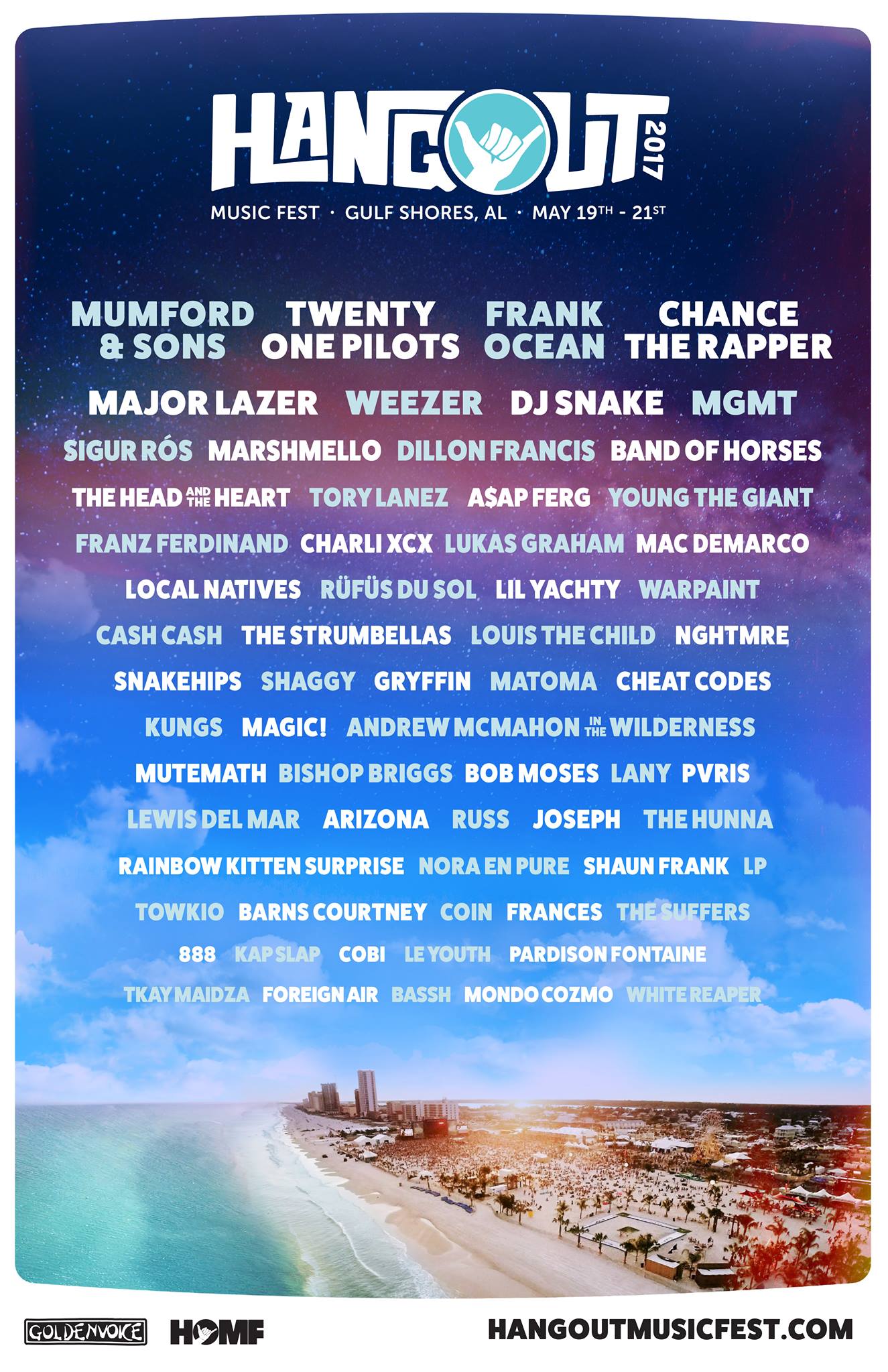 Mumford & Sons, Twenty One Pilot, Frank Ocean, Chance the Rapper, Major Lazer, Weezer, DJ Snake and MGMT will headline the Hangout Music Festival when it returns to Gulf Shores, AL May 29-21.