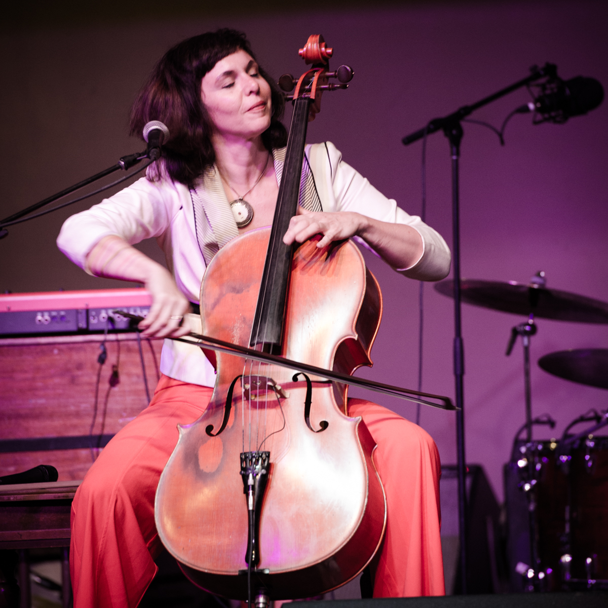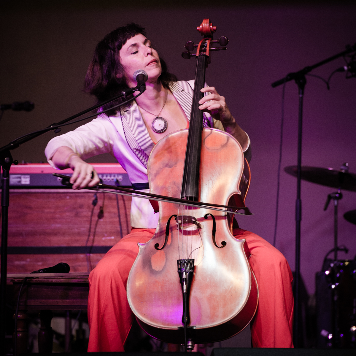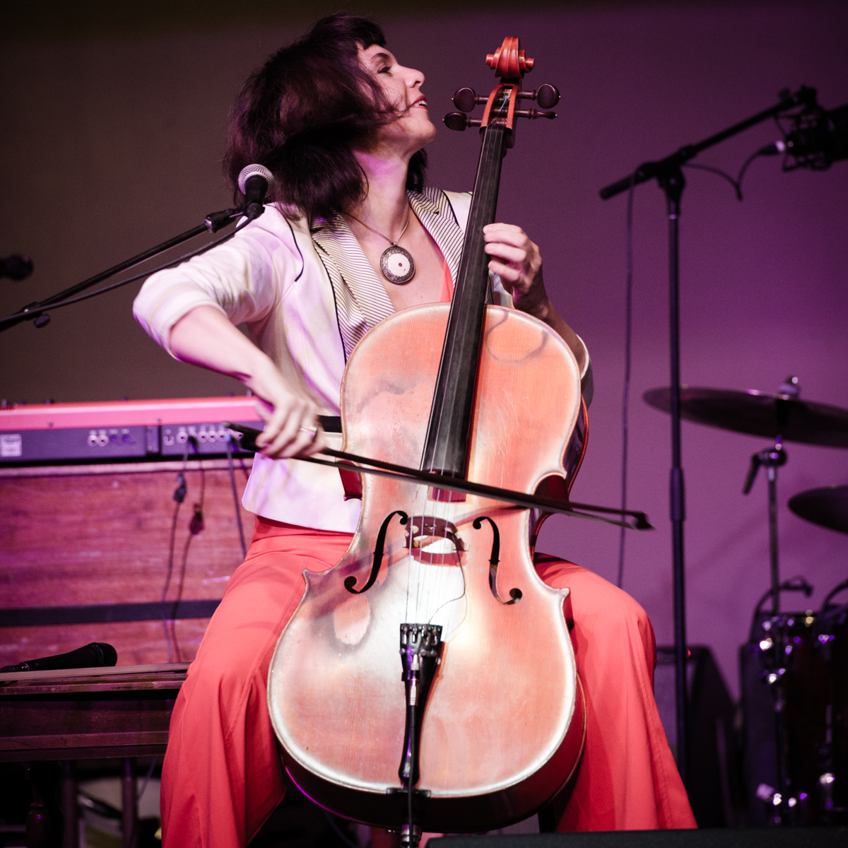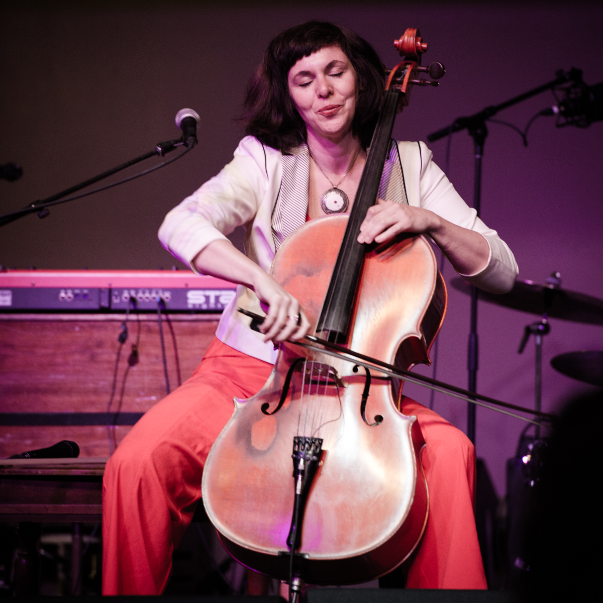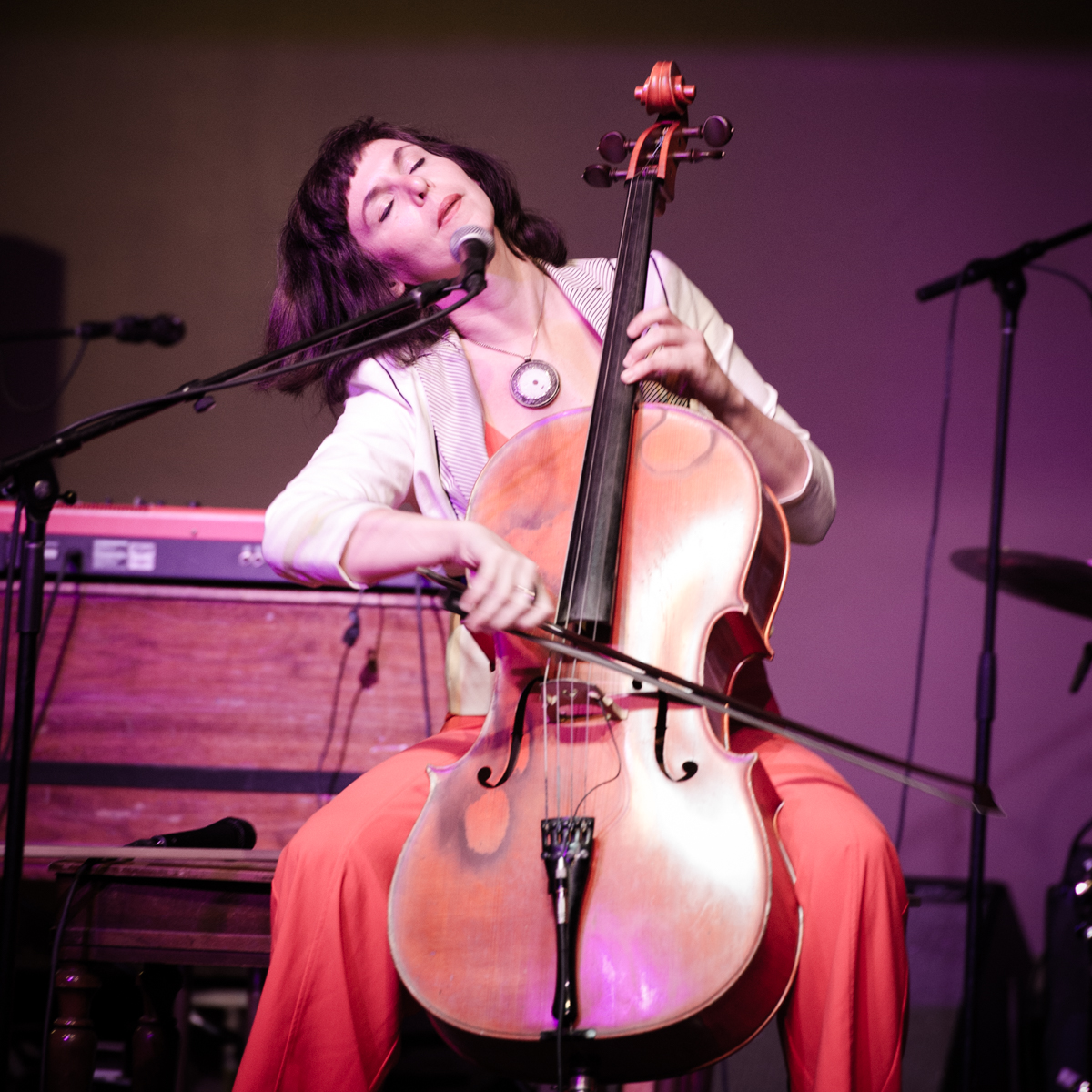 Sunday night at L’Extravagance, the Lycée Français school fundraiser formerly known as Fête de la Musique, Helen Gillet filled the big stage at Generations Hall with her solo act, playing her cello and loop pedal. Performing in between Bruce “Sunpie” Barnes and Galactic—all impressive acts for a school show—Gillet’s multi-layered work showed how much she’s grown as an artist in recent years. Not that she couldn’t fill and entertain a large room before—Gillet graced the OffBeat Mardi Gras cover already in 2010—but she now seems happier doing it.