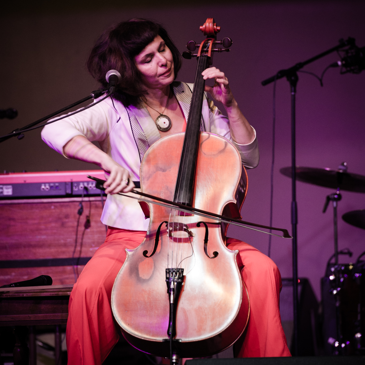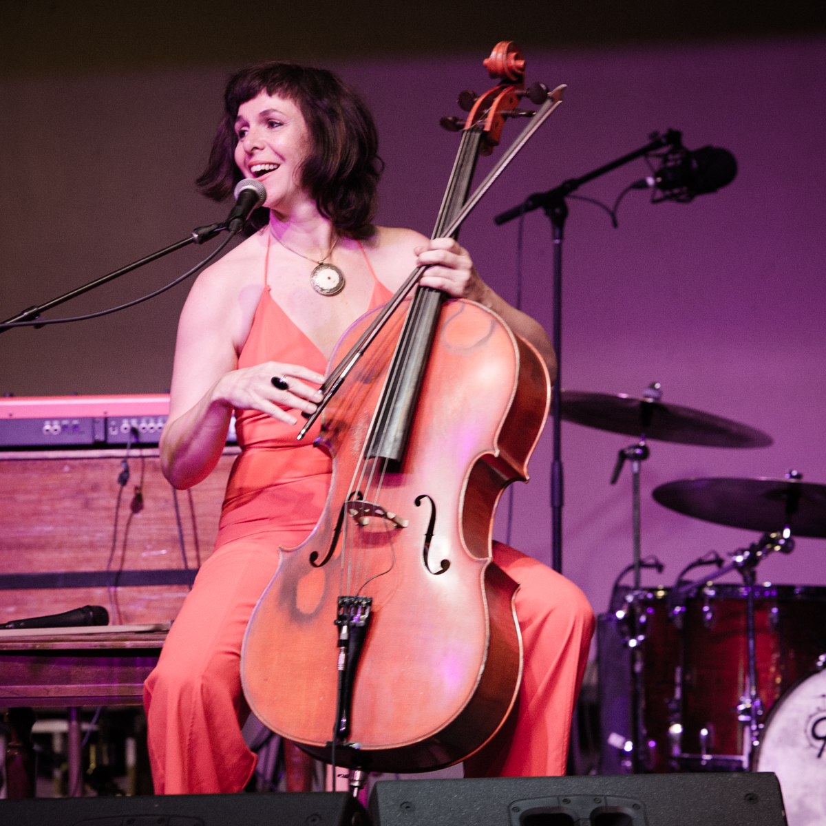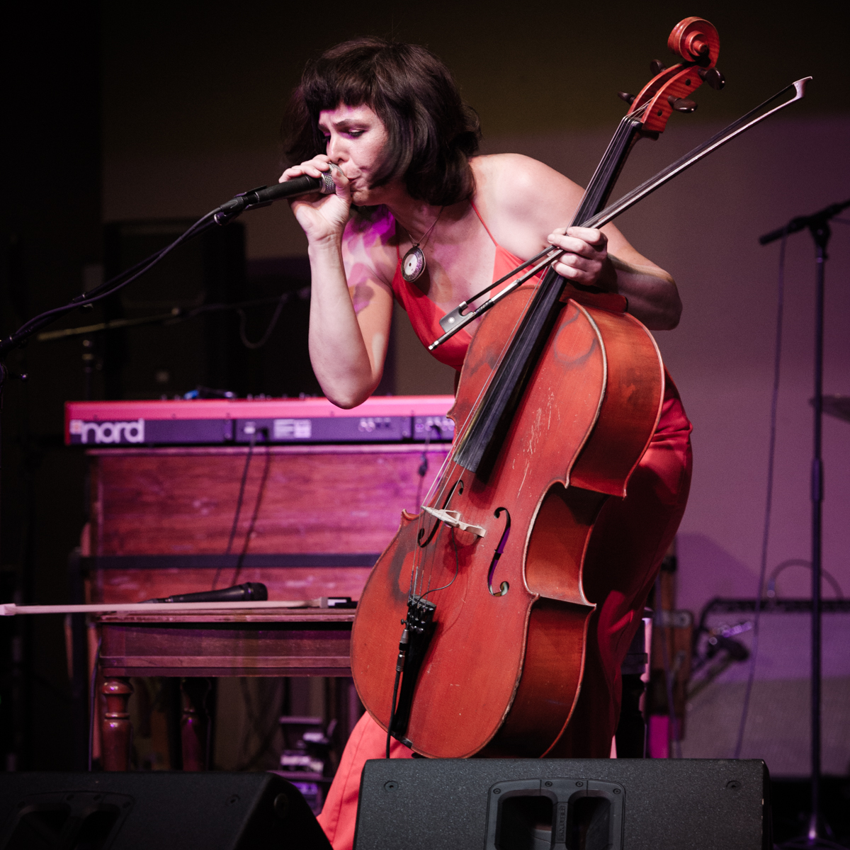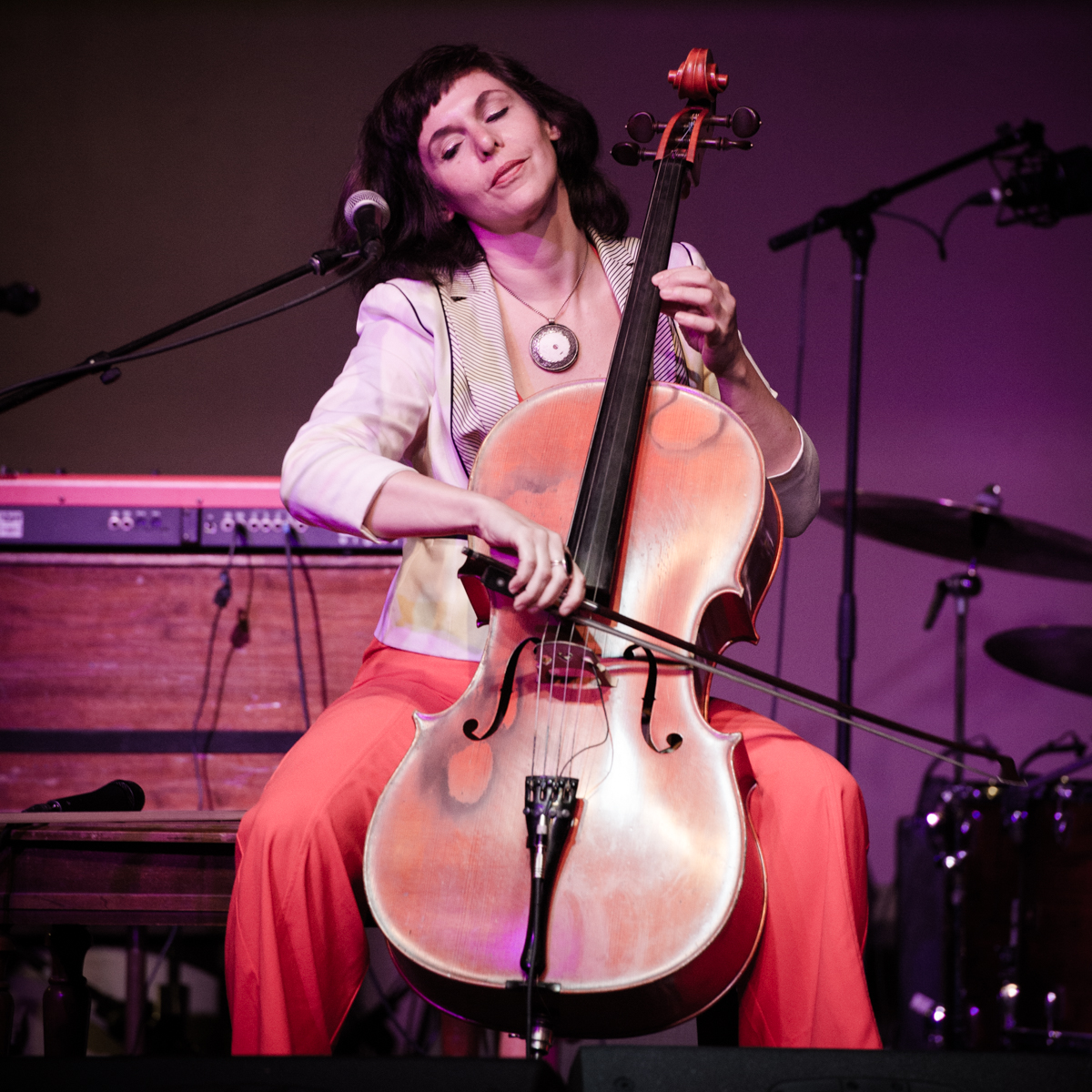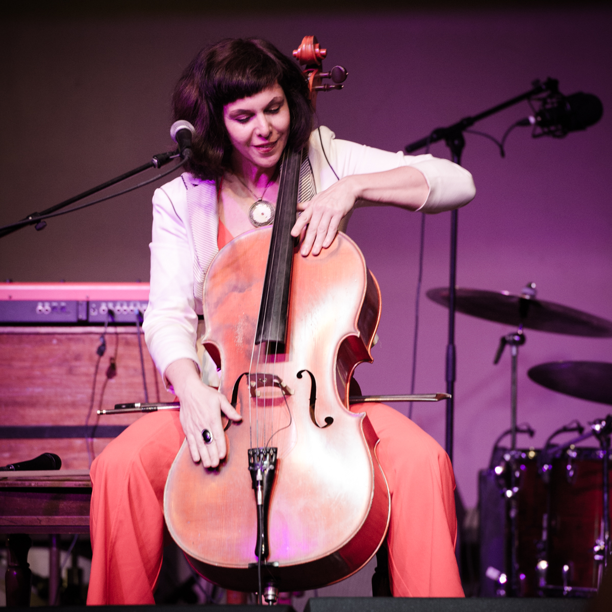 Sunday night at L’Extravagance, the Lycée Français school fundraiser formerly known as Fête de la Musique, Helen Gillet filled the big stage at Generations Hall with her solo act, playing her cello and loop pedal. Performing in between Bruce “Sunpie” Barnes and Galactic—all impressive acts for a school show—Gillet’s multi-layered work showed how much she’s grown as an artist in recent years. Not that she couldn’t fill and entertain a large room before—Gillet graced the OffBeat Mardi Gras cover already in 2010—but she now seems happier doing it.