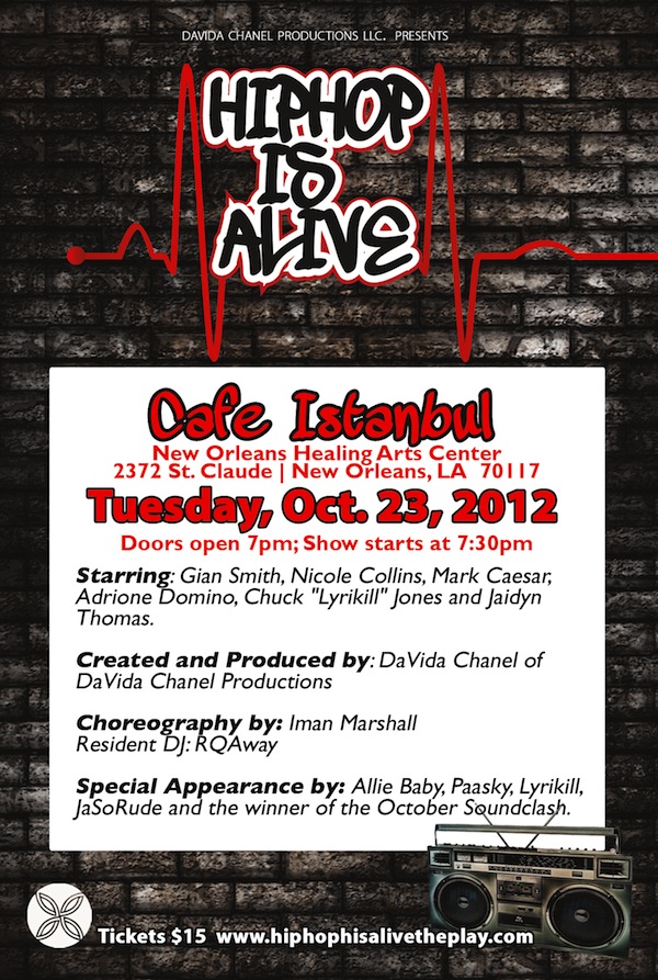 Remix — Hip Hop Is Alive, the play, returns this fall with a performance tonight (October 23) at Cafe Istanbul at 7:00 p.m. The play, itself, a favorite at last year’s Fringe Fest, casts local rappers as actors in a series of vignettes where dialogue revolves around popular hip-hop songs. Among others, tonight’s show stars rapper Chuck “Lyrikill” Jones and comedian Mark Caesar and features special appearances from Allie Baby and Paasky.