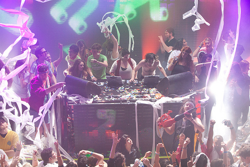 Girl Talk’s popularity has forced some changes that aren’t for the better. He has more show now, but much of the show seems to come from the Flaming Lips’ toy box. That doesn’t mean the confetti blasters and oversized balloons aren’t cool, but they’ve been done, and they’re not as compelling as the one bit of stagecraft the Flaming Lips haven’t had—the danger of being knocked off their own stage. The last time Girl Talk played House of Blues, there were so many dancers from the audience onstage that he and his rig were almost knocked off the stage lip by enthusiastic fans. That out of control element was missing this time as the number of fans allowed to surround him was kept manageable, and his set-up and table were far more stable. The new table was integrated into the light show and made it possible for him to climb on top of it, periodically working his laptops by hunching over them, but the drama was muted in the process.