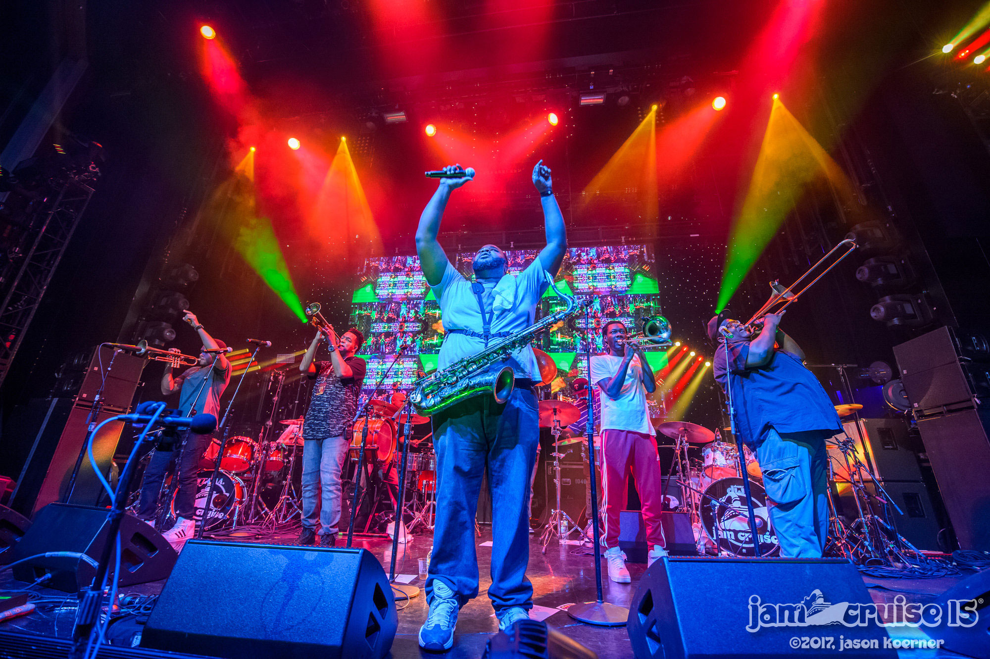 Speaking of late night music, it would be impossible to talk about Jam Cruise without mentioning its famed jam room. Led by a different artists every night, these grab bag shows mix and match a variety of musicians to create one-of-a-kind musical experience during the wee hours. Last night’s session was organized by Karl Denson’s Tiny Universe guitarist DJ Williams, who gathered artists like drummer Alan Evans and saxophone wizard Skerik for a run of original material, covers and, well, jams. New Orleans’ own DJ Soul Sister also kept the party going late with a Bass Ultra Lounge set that didn’t even begin until 3am.
